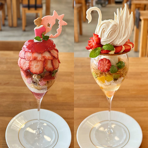 瓦テラスで人気の季節のパフェ。芸術的で写真映えすること間違いなしのパフェを、ぜひ足を運んでお召し上がりください。