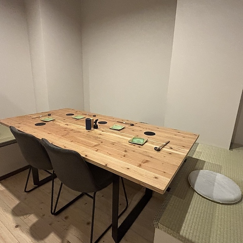 4名様~6名様が着席いただけるテーブル席は2つご用意しております。どのお席も明るい色の木目のテーブルを使用し、清潔感と温かみのあるお店造りを意識しております。広々とした店内は開放感もあり、ご家族や仲間とのお食事のほか、仕事帰りのサク飲みなど、少数から大勢など様々なシチュエーションでご利用いただけます。