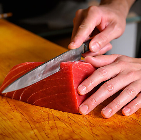 選び抜かれた素材を丁寧に調理する様子です。熟練の手によって、鮮やかな赤身の魚が一枚一枚、巧みに切り分けられています。そこには素材への深い理解と敬意があり、美味しさだけでなく、心が満たされる瞬間を味わえる、そんな雰囲気が漂っています。注文を終えてから、料理が来るまでの間も、どこか心地よさと感じます。