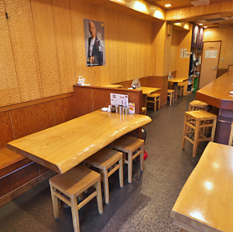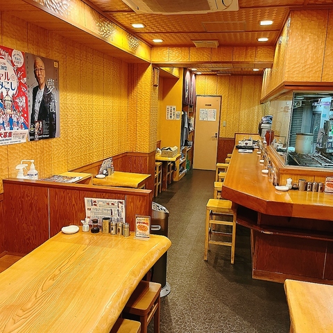 【活気あるフロア】カウンターと木製テーブル席