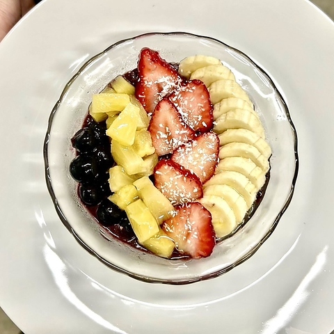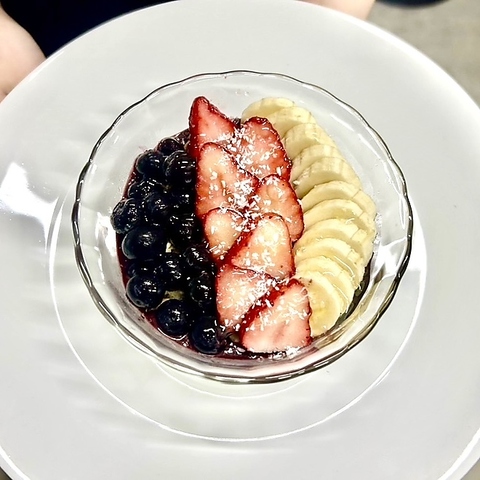 様々なフルーツが美しく盛り付けられたアサイーを用意しております。鮮やかなストロベリー、キウイ、バナナ、ブルーベリーが並び、見た目にも楽しませてくれます。色とりどりのフルーツは食欲をそそり、特別な日のデザートやパーティーのサプライズにもぴったりです。美しい盛り付けが印象的で、食べる前からワクワク感を感じさせてくれます!