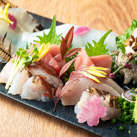 旬の魚種含む刺身の5種盛り合わせ。当店の鮮魚は、毎朝水揚げされた魚を九州より空輸で仕入れ鮮度抜群の状態でご提供致します♪※内容はその日の仕入れにより変わるのでお問い合わせください。