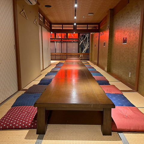 情緒溢れる落ち着いたお座敷席!和の趣を感じる広々とした空間で、靴を脱ぎ、リッラクスしてお食事を楽しめます。気の合う仲間との飲み会や、ご家族でのお食事、会社の宴会や接待に◎大人数での歓送迎会、会合にもピッタリの広さで、席替えも簡単にでき、柔軟なシーンに対応可能です。