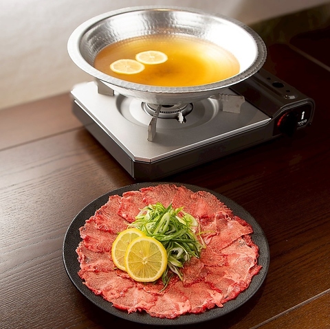 鳥取県のご当地、牛骨スープのお出汁には爽やかなレモンの香りをプラスした特製出汁。牛タンはスライスの厚みにこだわり、すっと潜らせると絶妙な食感としっかりとした旨みが口の中で溢れます。〆は絶品牛骨ラーメンでどうぞ。※+1,000円で日本酒銘柄の飲み放題をお付けできます