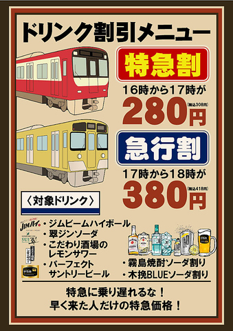 - <ドリンク割引メニュー>■特急割16時から17時が280円(税抜)、■急行割17時から18時が380円(税抜)!