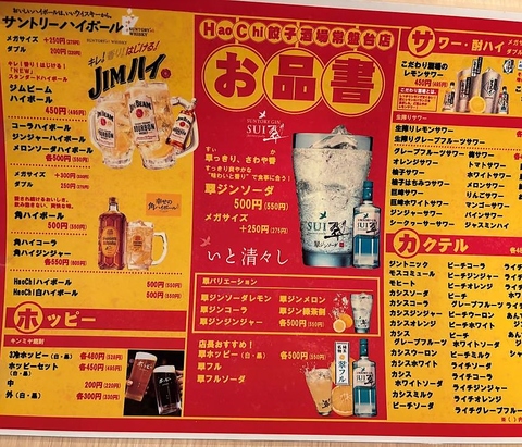 | お酒 | カクテル充実、焼酎充実、日本酒充実 |
