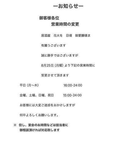 月~木: 16:00~翌0:00 (料理L.O. 23:30 ドリンクL.O. 23:30) 金~日: 15:00~翌0:00 (料理L.O. 23:30 ドリンクL.O. 23:30) 祝日: 15:00~翌0:00 |