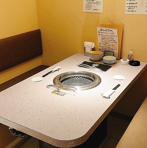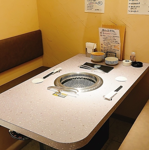 心落ち着く淡い白と茶色ベースでまとまった店内◎当店は半個室7席、大きな椅子のゆったりカウンターせきを完備しており、ゆったりお過ごしいただくことが可能です。厳選して仕入れた鮮度抜群のお肉をご提供しておりますので、是非ご利用ください♪
