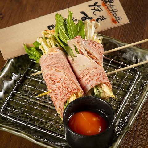 当店名物!新鮮野菜と上質なお肉を使用した野菜串巻き!職人によって一本一本丁寧に焼かれた野菜串巻きは、野菜が持つ歯ごたえとみずみずしさのバランスと、お肉の旨味を堪能できる当店の名物です!