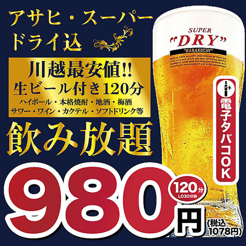 アサヒスーパードライやビアカクテル、日本酒が楽しめちゃう♪《980円》期間中毎日2時間飲み放題♪今だけお得に飲み会をお楽しみ頂けます!!※金曜/土曜/祝前日は+550円(税込)頂きます。