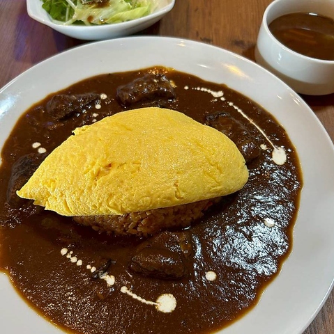 ナイフを入れた瞬間に幸せを感じるふわとろタマゴとチキンライスが絶品! サラダ・みそ汁付き