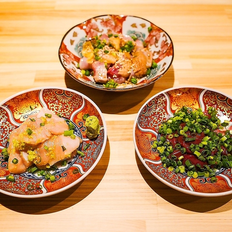 低温調理でしっかり下処理。親鶏のタタキ、低温調理レバーネギまみれ、鶏ささみユッケの極上鶏刺しメニュー