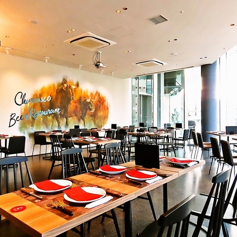 広々としていて開放的、テーブル席でゆったりとお楽しみいただけます。シェフが調理する、絶妙な焼き加減の肉料理を是非ご堪能ください!特に目の前で肉を切るパフォーマンスは必見です!!