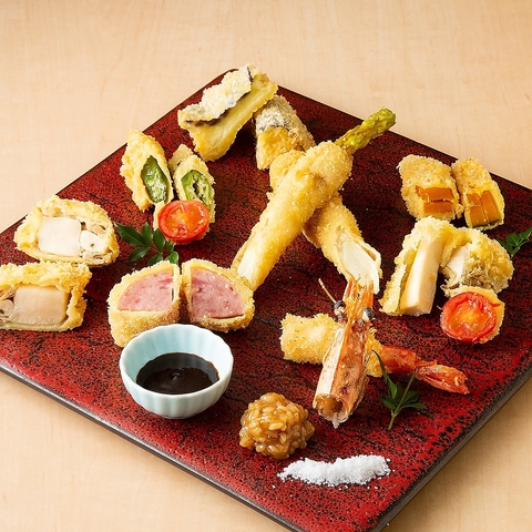 彩り豊かな野菜、旨みあふれる魚介、そして肉の濃厚な味わいを、一口サイズのカツに仕立てました。サクッと軽やかな衣の中に、それぞれの素材が持つ旨みがぎゅっと詰まった贅沢な盛り合わせ。野菜4種、魚2種、肉2種のバランスで、最後まで飽きずに多彩な味わいを楽しめます。お酒との相性も抜群で、会話を弾ませるひと皿です。