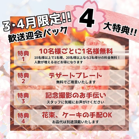 歓送迎会に最適な4大特典パックをご用意。ご予約時にお電話かネット予約備考欄にてご連絡ください。