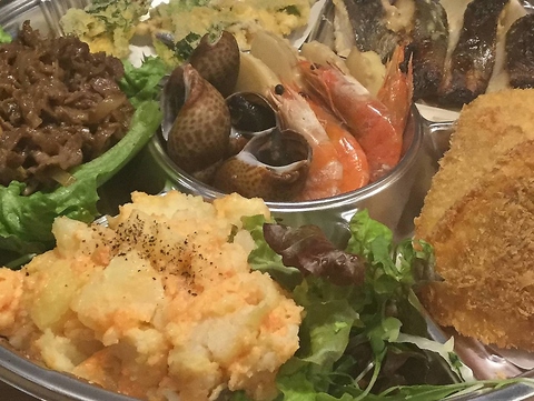 2~3人前 だし巻き、鶏のから揚げ、串カツ、温ポテトのサラダ、焼き魚、旬野菜の煮物など。