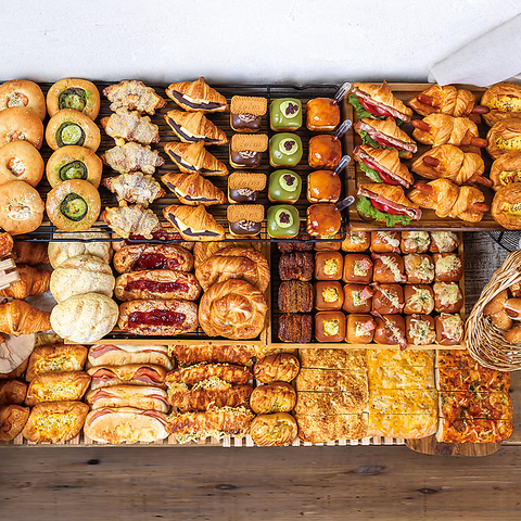 棚に並んだ、パン特有のふんわり甘い香りが店内中に広がります。シェフが厳選したメニューを常に数十種ご用意し、それはしっかりお食事として食べ応えのあるパンだったり、スイーツのように甘くあっという間になくなるパンだったり様々。おひとり様でも団体様でも楽しめる当店のパンを、心ゆくまで味わい尽くしてください。