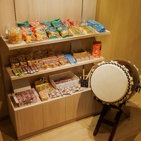 まるでお菓子の宝箱のような、色とりどりのお菓子が並ぶコーナーがあなたを待っています♪懐かしい味から新しい発見まで、心躍るラインナップが魅力的◎ 目を引く和太鼓も雰囲気を盛り上げています。ぜひあなたのお気に入りのお菓子を見つけに来てください。【京都/河原町/食べ放題/飲み放題/海鮮/海鮮/肉/焼き鳥/おでん】