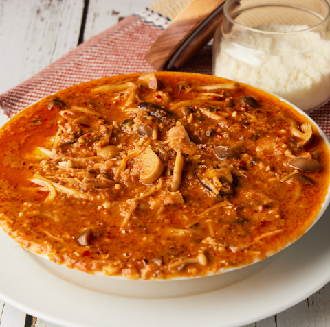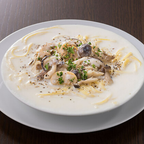 自家製ミートソースに生クリームとオリーブを加え、ニンニクと唐辛子でパンチを効かせた、濃厚スープソースにキノコベーコンソテーをトッピングした具沢山でやみつきになる、唯一無二のミートクリームスープスパゲッティ