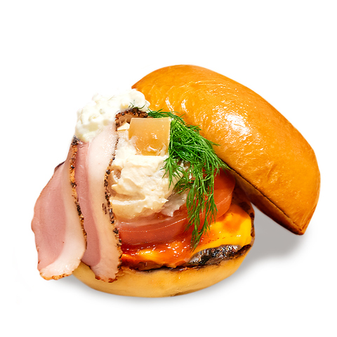 コンポートしたりんごとなめらかなクリームチーズ、さらにスモークした鴨をトッピングした贅沢なハンバーガー。今年はブリオッシュバンズでご用意しました!