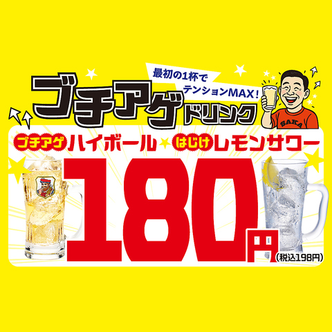 ブチアゲハイボールとはじけレモンサワーは180円から。まずは一杯、気軽に楽しめる定番ドリンクです。