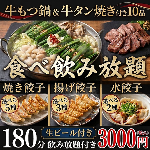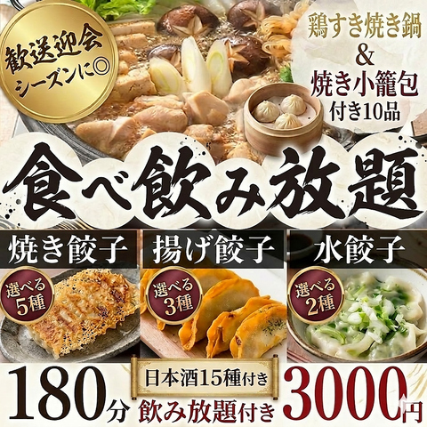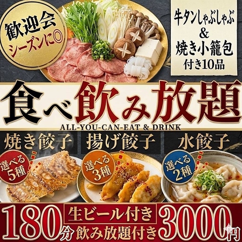 当店人気No.1♪歓送迎会や各種宴会等に◎5種の焼餃子&3種の揚餃子&2種の水餃子が80分食べ放題+日本酒30種付き180分飲み放題付きで3500円と超お得♪更に《牛タン焼き》付き!大人の方には4000円のコースがおすすめ!《牛タンや仙台せり鍋》をお楽しみいただけます!《完全個室》で喫煙可能♪幹事様にかなりお得なクーポンも◎