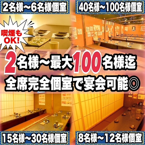 2名様~最大100名様まで《完全個室》へご案内させていただきます♪喫煙可能です!大人数ご宴会にも最適◎!
