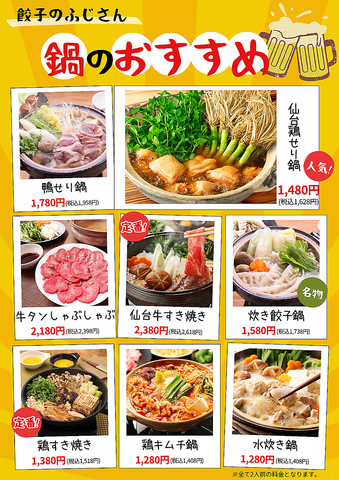 学生に大人気♪忘年会や各種宴会等に◎5種の焼き餃子&3種の揚餃子&2種の水餃子が80分食べ放題+日本酒30種付き180分飲み放題付きで3500円と超お得♪更に《牛タン焼き》付き!大人の方には4000円のコースがおすすめ!《牛タンや仙台せり鍋》をお楽しみいただけます!《完全個室》で喫煙可能♪幹事様にかなりお得なクーポンも◎