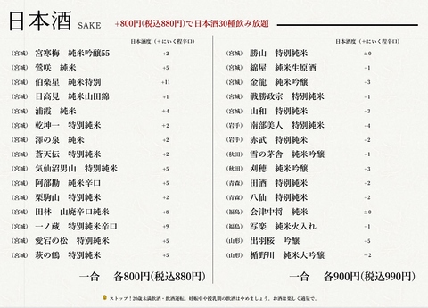 地域最大級!?宮城地酒含む《東北地酒30種》が飲み放題!