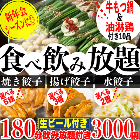 《生ビール付き!》たっぷり180分飲み放題+ 《焼き餃子&水餃子&揚げ餃子の食べ放題》付き全10品3000円!新年会におすすめのコースをご用意しております!《油淋鶏》などお酒と相性抜群の品から《牛もつ鍋》と当店自慢のお料理もご堪能いただけます♪全席完全個室のため様々なシーンで大活躍!!少人数でのご利用から団体様までお待ちしております!お得な〈クーポン〉も要チェックです◎