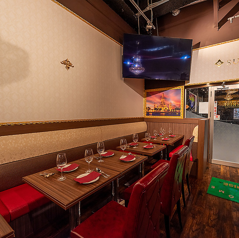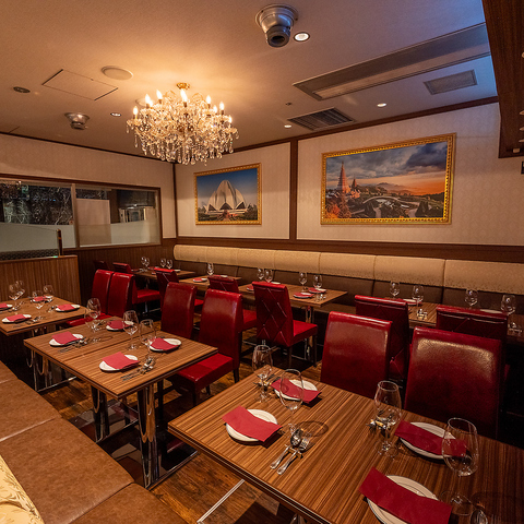 落ち着いた雰囲気の店内は、木目調のテーブルと赤いシートが印象的。シャンデリアの灯りが華やかさを演出し、デートや女子会にもぴったりの空間です。