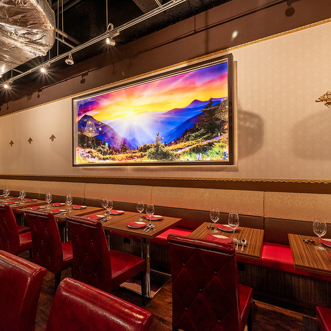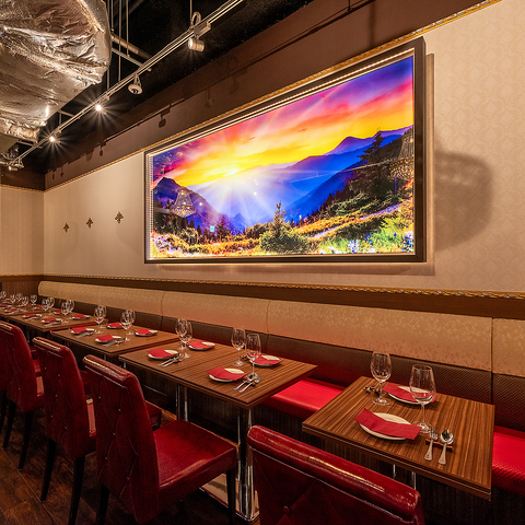 壁一面の大きなアートときらめく照明が彩るおしゃれな店内。広々としたレイアウトで、少人数から大人数まで快適に過ごせる居心地の良い空間です。