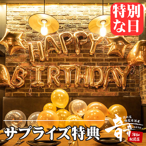 浦和での誕生日・記念日、女子会などにおすすめのサプライズ特典をご用意しております。事前予約で、メッセージ入り特製デザートプレートをご用意!(※別途料金を頂戴しております。)浦和で飲み放題コースがおすすめの個室居酒屋をお探しの際は[音音]へ。歓送迎会にも♪飲み放題も個室も充実!![浦和駅近く、飲み放題と個室が充実の居酒屋]