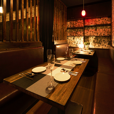 赤と黒を基調にした洗練されたデザインの店内は、どこを切り取ってもフォトジェニックな非日常空間。照明の陰影が空間に深みを与え、まるで大人の隠れ家のような上質な雰囲気が漂います。テーブル席やボックス席は仕切りがあり、プライベート感も確保。デートや女子会はもちろん、少人数での会食や接待にも最適です。