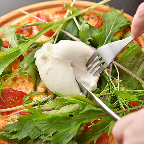 濃厚なブラータチーズを丸ごとのせた贅沢なピザは、チーズ好きにはたまらない一皿。切り分けた瞬間にとろけ出すクリーミーな中身が、生地に絡んで絶妙なハーモニーを生み出します。モチモチの生地とさっぱりトマトソース、バジルの香りが一体となり、見た目にもインパクト抜群。ワインとの相性も抜群の人気メニューです。