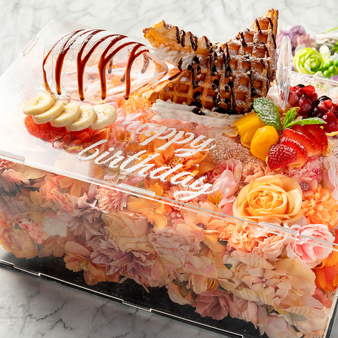 お花がいっぱいに詰められたフラワーボックス。豪華なボックスで楽しむ特製メッセージ付きのデザートプレートで特別なサプライズをお手伝いいたします!
