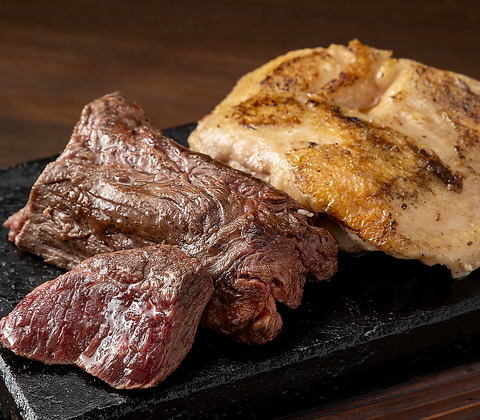 厳選された柔らかい牛フィレ肉と、肉汁あふれる自家製ハンバーグを一皿に贅沢に盛り合わせました。上品な赤身の旨みと、ジューシーな食感をご堪能ください。