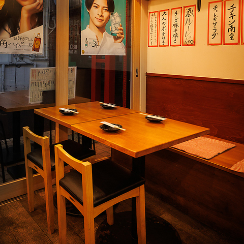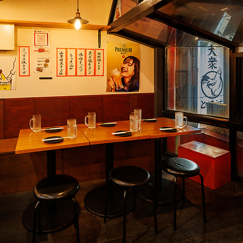 サクッと立ち寄れて、気軽さが嬉しい街角のテーブル席!ちょい飲みや気軽な飲み会にピッタリ!壁には手書き風のメニューが並び、レトロ感も満載!外の光も入りやすく、明るく開放的な雰囲気の空間です!
