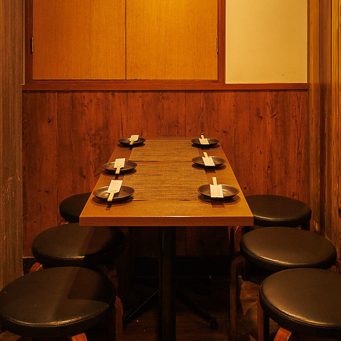 落ち着いた雰囲気で会話も弾む扉付き個室!シンプルで使いやすいでーぶるで、丸椅子を囲んでゆったり過ごせます!少人数グループの飲み会や会社宴会にもピッタリな、リラックス重視のこだわり個室です!