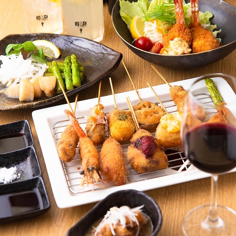 落ち着いた店内で大阪名物の串カツとワインを堪能できます。明治大正情緒を感じる趣のある空間で、ジャズの音色が心地よく響きます。ご宴会や女子会に最適なこの場所では、人気の「天使のエビ」や世界三大珍味「フォアグラ」も楽しめ、味に絶対の自信を持つ逸品をご提供♪