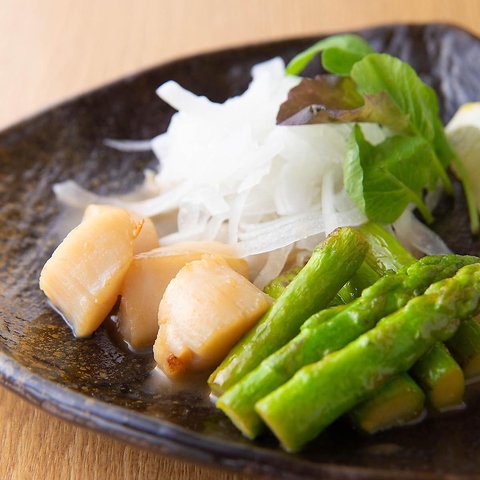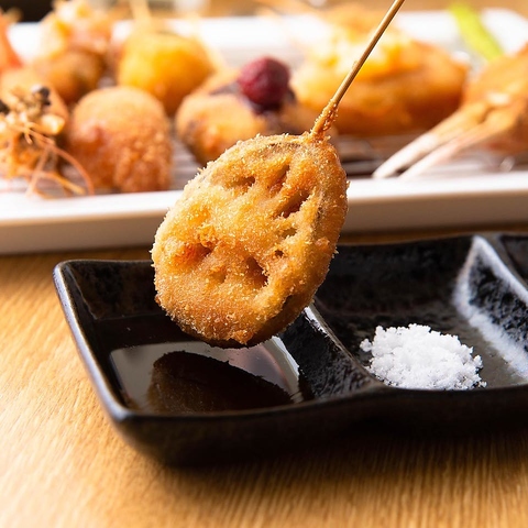 毎朝中央市場から仕入れる新鮮な旬の魚介、野菜を使用しています。お刺身でも食べられる鮮度の魚介を贅沢に串カツに。