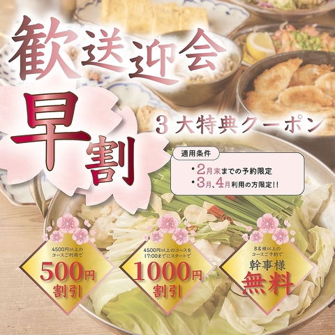 「3・4月春宴会は今が予約どき!早割3大特典で断然お得に!」3・4月のコース予約を2月末までにすると【1】4500円以上のコースが500円OFF【2】8名様以上で幹事1名様無料【3】17時迄のスタートでコース1000円off(4500円以上)。宴会当日は皆が笑顔で大満足な会に…。詳細はクーポン欄をCheck!