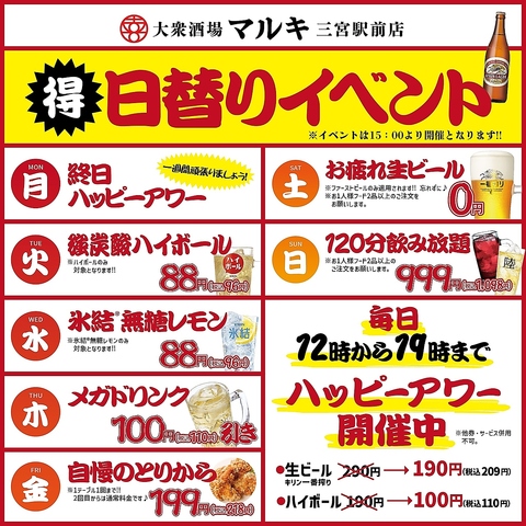 毎日が超お得!三宮駅すぐ!毎日12~19時はハッピーアワーで生ビール190円、ハイボール100円♪さらに曜日ごとの日替りイベントも充実!月曜は終日ハッピーアワー、火曜は強炭酸ハイボール88円、水曜は氷結レモン88円、土曜は生ビール無料!週末は飲み放題もお得に楽しめる!今夜はマルキで乾杯!