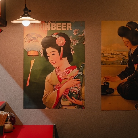 店内はレトロな雰囲気を残しつつ、明るく清潔感があり、女性も入りやすいよう工夫されています!昭和の美人画ポスターなどが飾られ、古き良き日本のノスタルジーを感じられます。カウンター席は、お一人様でも気兼ねなく食事ができる造り◎仕事帰りのサク飯や気軽な食事など、様々なシーンでご利用いただけます。