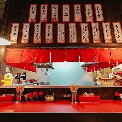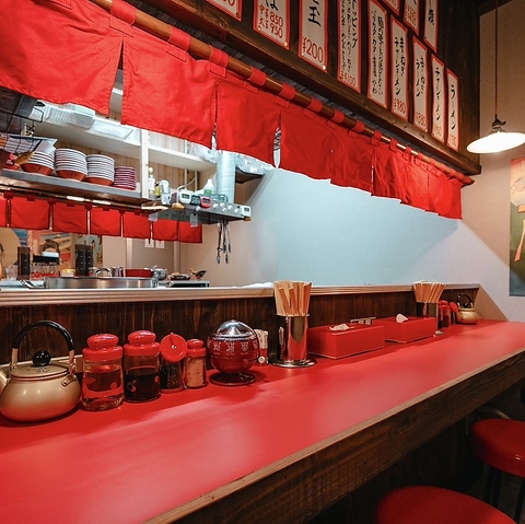 木の温もりを感じる落ち着いた空間に真っ赤なカウンター席が映える店内!お一人様からお気軽にご利用いただけるよう、カウンター席をメインにご用意しております♪席からは調理の様子が垣間見え、ライブ感も楽しめる◎ラーメン屋らしい活気がありつつも、清潔感のある空間なので女性のお客様も安心してご来店いただけます。
