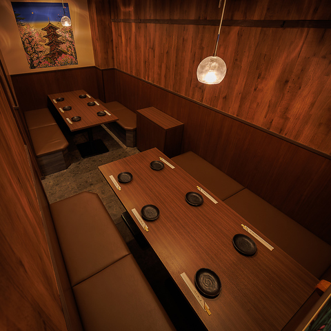 8名様から20名様までご利用いただける、広めの個室も完備しております♪都会の騒音を忘れられるデザイナーズルーム!大人気のお部屋となりますので、ご予約はお早めがオススメです!小規模のご宴会などにはピッタリなオシャレな和装のお部屋を多数取り揃えております!