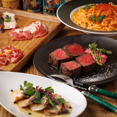 厳選素材を贅沢に味わう人気コース。生ハムや牛タン、ローストビーフの前菜に始まり、リンゴと生ハムのサラダ、有頭エビと根菜のフリット、燻製秋鮭のソテーなど旬の味覚が満載。メインは和牛内ももステーキを赤ワインソースで上品に。牛すじラグーラザニアや季節のパンナコッタまで堪能できます。
