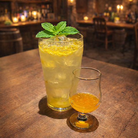 国産柑橘(温州みかん+夏みかん)の果肉入りシロップを、炭酸水でさっぱりと。別添えの追いシロップは、お好みのタイミングで加えて、香りと甘みの変化を楽しめます。氷は氷屋の氷を使用。