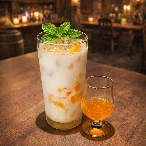 国産桃の果肉をごろっと入れたピーチシロップに、オレンジの爽やかな甘みを重ねたフルーツドリンク。別添えの“追いシロップ”で、桃の濃厚さを自分好みに追加できます。最初はすっきり、後半はとろり濃厚――飲み進めるほど果実感が深まる一杯です。氷は氷屋の氷を使用。