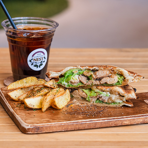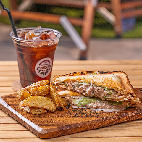 自家製テリヤキをホットサンドにした一品。店内で焼き上げた、出来立てアツアツを召し上がりいただけます!ポテト付きで食べ応えもあり、ランチにも軽めの食事にもおすすめです。オプション:コーヒーセットやドリンクセットなど